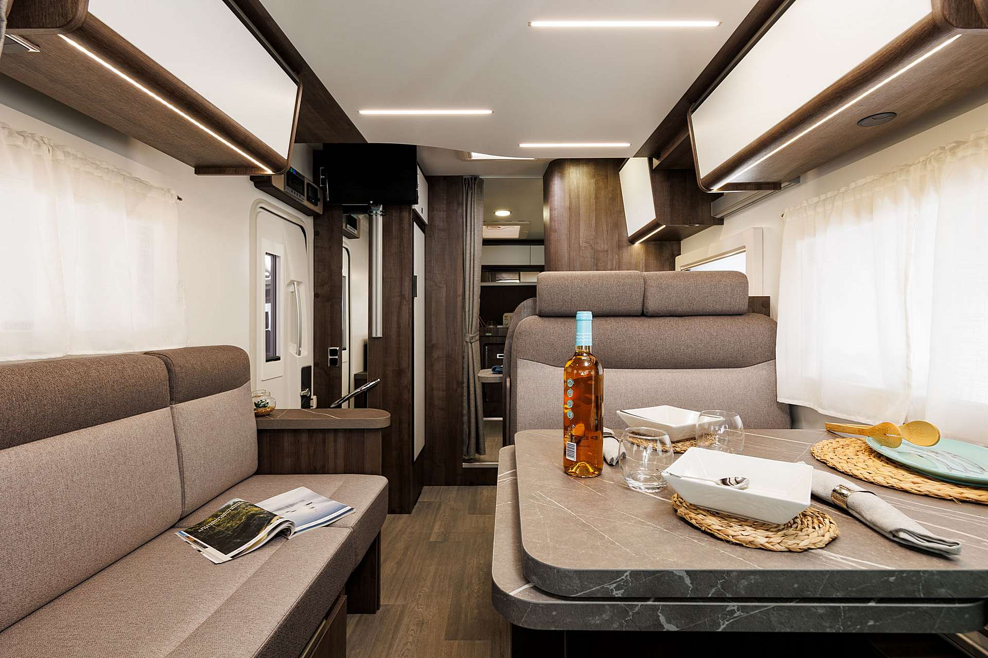 - En la zona del comedor hay dos sofás dobles y asientos giratorios, además de la mesa extensible.